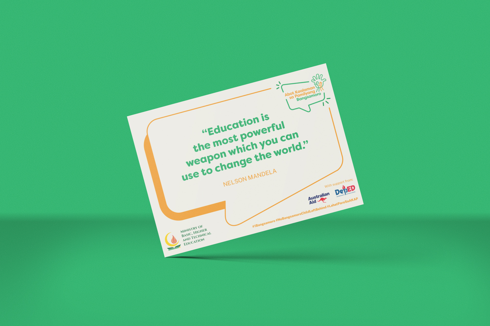 LEFT: 1) Infographic presenting the state of education in the Bangsamoro region and the AKAP Program's accomplishments, and 2) FAQs about the AKAP Program. RIGHT: Postcard given to learners under the AKAP Program.