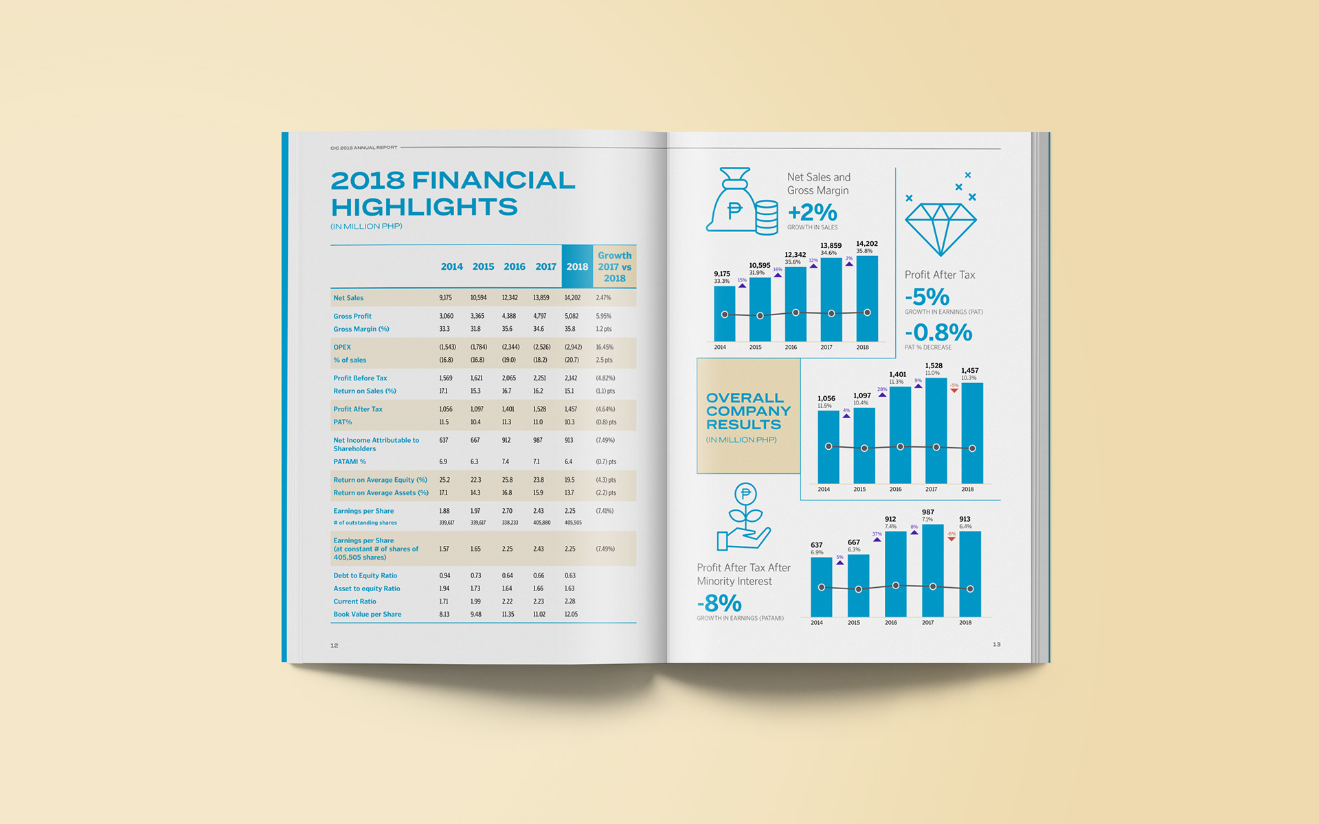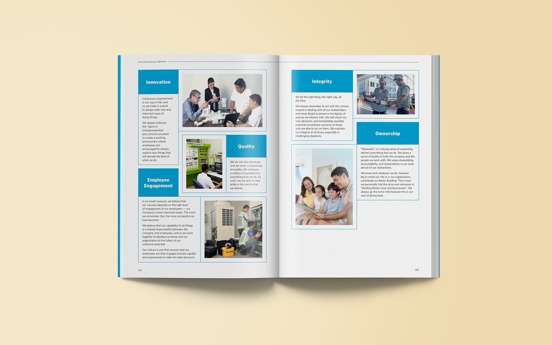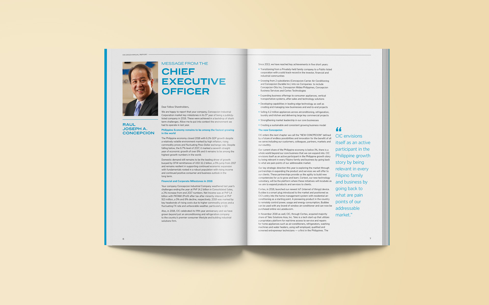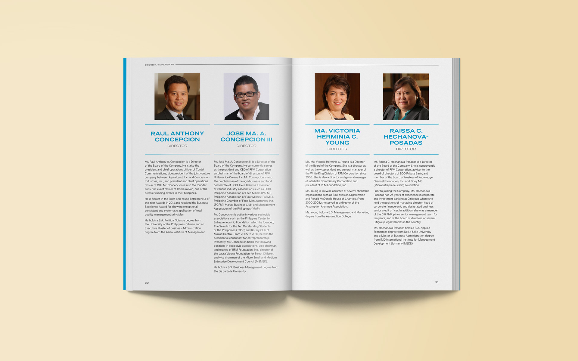 I was tasked to do the layout for Concepcion Industrial Corporation's 2018 annual report. We were free to explore the overall look, starting with the cover design. Having worked with CIC in the past, they wanted to keep the layout simple but modern while keeping the palette within the brand's identity. The annual report would be distributed to the company's stakeholders in digital format.
